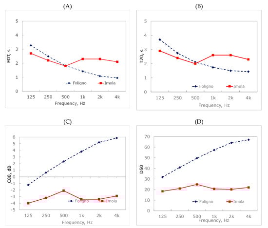 Measured parameters in S. Dominic of Foligno, performed in 2001. (A) EDT; (B) T20; (C) C80; (D) D50.