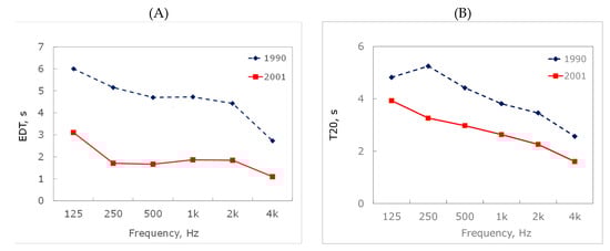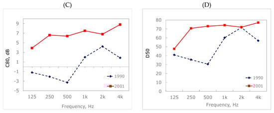 The graphs in Figure 5 are obtained by considering the average values of all the measured points. The monoaural acoustical parameters of the measurements performed in 1994 were calculated from both the binaural channels of the dummy head, as it was used to do in that period (one of the examples is given for La Fenice theatre of Venice) []. The same parameters measured after 2001 were obtained from the W channel of the Soundfield microphone.