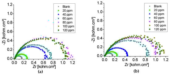 where Rinhibitor is the resistance after the addition of corrosion inhibitor, whereas Rblank is the resistance before the addition of the corrosion inhibitor. In this study, the concentration range of the new ILs used was 20–120 ppm to get the optimum concentration for corrosion inhibition in brackish water. The optimum concentration of the IL1 and IL2 precursors, which have corrosion inhibition concentration potential, was reported previously to be in the range 80–100 ppm []. The resistance value after the addition of the inhibitor will be higher than the resistance value without the addition of the corrosion inhibitor as reported earlier by others [,]. This shows that the resistance on the electric surface will be much higher if the carbon steel surface has been coated by the corrosion inhibitor. Consequently, the semicircular diameter of the Nyquist Z curve will enlarge after the addition of corrosion inhibitors []. The IE% of IL2 is higher than IL1 due to the presence of three butyl chains in IL2 which increase hydrophobicity and also decrease the interaction between the steel surface and the corrosion agent as reported by Zunita et al. [] and also the longer alkyl chains can increase the inhibition efficiency in 1% NaCl. Based on Figure 2, the Zr to −Zi data with the addition of 80 ppm IL1 and 60 ppm IL2 showed the effect of the decreasing corrosion rate. The increased corrosion resistance in the system was indicated by the larger diameter of the semicircular curve. However, when the IL1 concentration was increased to 100 ppm and IL2 to 120 ppm, the results showed a slight decrease in the corrosion inhibition. This validated that the optimum range for corrosion inhibition for IL1 was around 80–100 ppm and for IL2, it was around 60–100 ppm, with the best corrosion inhibition concentration at 80 ppm for IL1 and 100 ppm for IL2.
