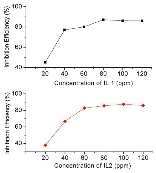 Percent inhibition efficiency (IE%) of IL1 and IL2 were calculated by Equation (1) as per Popova et al. []: