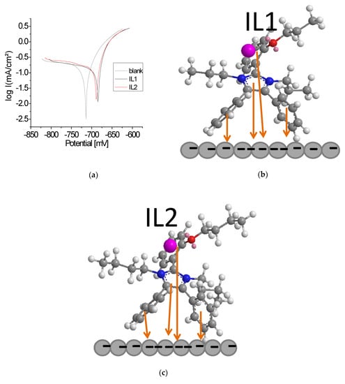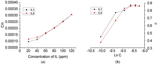 Figure 4 shows that IL1 and IL2 showed a better fit in the Langmuir adsorption model than the Temkin adsorption model. IL1 and IL2 have big steric hindrance and high hydrophobicity properties and during the corrosion reaction on carbon steel surfaces, the bulk cations of IL1 and IL2 can easily and directly bind to electrons on the metal surfaces. In addition, the R2 values of IL1 and IL2 for each curve in Figure 4a showed that the adsorption mechanisms of new ILs follow the Langmuir adsorption isotherm with the R2 value close to 1 for IL1 and IL2 (i.e., 0.983 and 0.965, respectively) and it is almost linear. The R2 values of IL1 and IL2 following the Temkin adsorption mechanism were far from linear form as shown in Figure 4b. Table 3 also showed that IL1 and IL2 followed the Langmuir adsorption model with ∆Gads of −35.04 kJ/mol for IL1 and −34.04 kJ/mol for IL2. In general, these ∆Gads values show that the adsorption of IL1 and IL2 have occurred on carbon steel surface due to semi-chemical adsorption and or physical adsorption as indicated by their ∆Gads, which is higher than −30 kJ/mol and lower than −40 kJ/mol [,,].