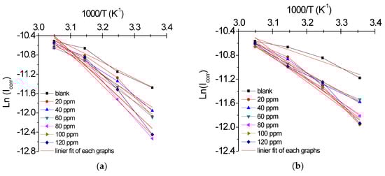 Graphs of the activation energy (Ea) determination (Ln(Icorr) towards the 1000/T) subsequent to the addition of IL1 (a) and IL2 (b) in various concentrations.