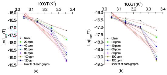 The thermodynamic parameters of the corrosion inhibition process were also investigated. The thermodynamic parameters were very important to show whether the corrosion inhibition reaction in the system was occurring. Thermodynamic parameters can be obtained from Equation (8) below [].