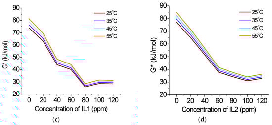 Kinetics data (activation energy) of IL1 and IL2 were also evaluated by the EIS method following Equation (7) [,]. The activation energy (Ea) shows the lowest energy needed to carry out the corrosion reaction [,]. The activation energy (Ea) for IL1 and IL2 for the various concentrations at various temperatures is given in Figure 5: