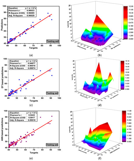 Ensemble RF and GEP approach are compared with other supervised machine learning algorithms, namely ANN and DT as depicted in Figure 6. These techniques, along with GEP, are individual algorithms. However, RF is an ensemble one which incorporates a base learner as an individual learner and model it with bagging technique to give an adamant strong correlation. It should be kept in mind that all models are based on python (anaconda). The comparison of models is presented in Figure 6. The RF outburst in performance of the model can be seen with R2 = 0.96 and its error distribution as shown in Figure 6a,b. Whereas individual models ANN, DT, and GEP show good response with R2 = 0.89, 0.90, and 0.90, respectively. Figure 6d represents the error distribution of decision tree with maximum error below 10 MPa. However, 18.19 MPa is reported as the maximum error. A similar trend has also been observed for ANN and GEP models with maximum error values of 11.80 MPa and 7.48 MPa, respectively as shown in Figure 6f,h. Moreover, researchers used different algorithm-based machine learning techniques for the prediction of mechanical properties of high strength concrete. Ahmed et al. [63] used an ANN algorithm and forecasted the mechanical properties (slump and compressive strength) of HSC. The author evaluated its model with ANN and revealed strong correlation for slump and compressive of about 0.99. Singh et al. [64] forecasted the mechanical properties of HSC by using RF and M5P algorithms and reported strong correlation for the testing set of 0.876 and 0.814, respectively.