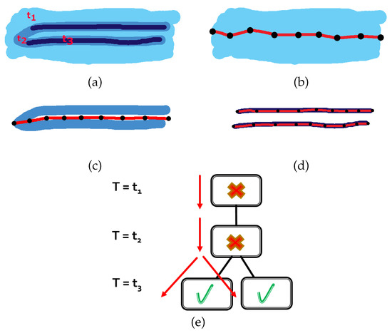 Illustration of thresholding on a synthetic component. (a) Component is composed of three gray levels with ascending values . (b–d) Child components from thresholding the parent component with  respectively and their approximating splines. (e) Bread first traversal of the component tree.