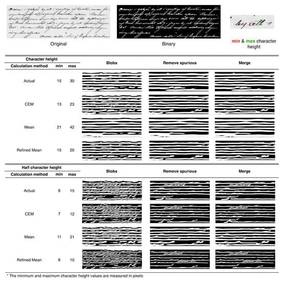 Figure 7 shows that there are no sharp changes between the results of different height estimations. This is valid for such sample document without severe noise. As can be seen, the half values of range values provide thinner blob lines that are more apart while provoking spurious blob lines. Qualitative analysis revealed a considerably higher performance and lower run time of the half-refined mean estimation for character height range (Figure 8).