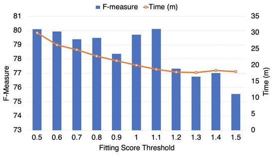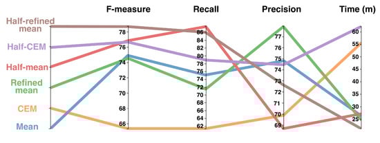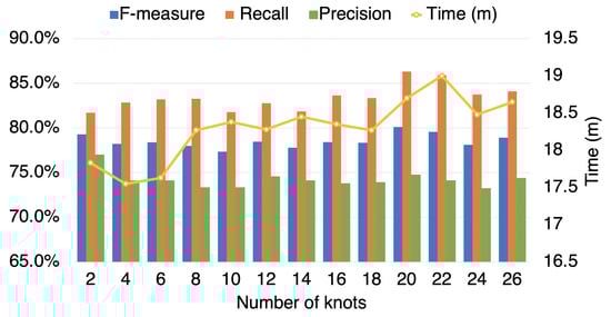 The aim of using splines is their ability to fit on curved blob lines as well as straight blob lines. Cohen et al. [] uses 20 knots to fit the linear splines. We investigate different number of knots and show their effect on the method’s performance. Results are presented in Figure 10. As expected, varying the number of knots does not impact the performance measure, because almost all text lines in the evaluation datasets are horizontal. However, the spline fitting makes the proposed method suitable for curved text lines []. It is apparent that recall values follow a higher trend than the precision values, possibly due to the spurious blob lines that could not be eliminated by the label cost because of crowded ascenders and descenders overlapping these spurious lines.