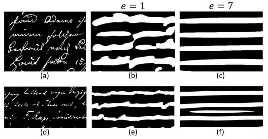 The proposed method assumes the text lines are almost horizontal. Therefore, convolution of a text line with the second derivative of an anisotropic Gaussian elongated along the horizontal direction generates a blob line that strike-through the text line. Figure 11 shows the blob lines resultant from two marginal cases:  and . There is a trade-off between the marginal cases. As e decreases as the blob lines are tight-fitting, e increases as the blob lines are loose-fitting. Tight-fitting misses the spatial context and may consider two touching text lines as one (Figure 11b). Loose-fitting grasps the unrelated spatial context and may generate spurious blob lines (Figure 11f). From the performed experiments, the optimal point seems to be when  (Table 3).