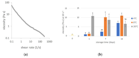The discussion on the storage effect will focus on the viscosity at a shear rate that is relevant for field applications. A shear rate of 10 s−1 was chosen as it is within the expected shear rate range for algae harvest and pumping [31] and food processing [37]. During concentrate storage (Figure 5b), storage time, temperature, and their interaction affected the viscosity (p < 0.01). Already after 1 day of storage at 20 °C, the viscosity increased strongly, i.e., about 10 times compared to the t0 situation. The viscosity increased at a slower pace during 4 °C and 8 °C concentrate storage (Figure 5b). This finding has important implications for the organization of a P. purpureum processing facility. Once the culture is centrifuged, the concentrate should either be immediately processed or immediately cooled in order to minimize energy requirements for pumping and mixing. In the case of dilute culture storage, only storage time had an impact on the viscosity of the concentrate obtained after dilute culture storage (p < 0.001), and this effect interacted with storage temperature (p = 0.013, Figure 5d). No large viscosity increase was observed compared to the t0 concentrate.