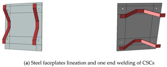 Researches on the CSC shear connectors proposed by Leekitwattana et al. [23] have been limited to theoretical studies due to the practical problems of the two end welding, especially in slabs. In 2017 and 2018, Yousefi and Ghalehnovi [30,31] investigated and compared the performance of CSCs for interlayer shear behaviour using Push-out tests in two states of one end welded and two ends welded. The interlayer shear strength of the CSCs in the two ends welded form was approximately twice that of the one end welded. In addition, in two end welded state due to bonding of faceplates, there was no sudden failure, and thus more ductility and energy absorption were provided. Therefore, they proposed a method to perform the two end welded of CSCs, which could help to make easily in construction site and improve structural performance [32]. In this method, as shown in Figure 2a, in the first step, steel faceplates are accurately measured and lined for the installation of the CSCs and creation of the holes required for plug weld. Plug weld is done by filling the holes with arc welding to connect steel faceplates to the inaccessible end of the CSC connectors. Then, the one end of CSCs is welded on steel faceplates. In the following, in accordance with Figure 2b, the two steel faces are located in the opposite position, so that the other end of the CSCs can be welded to steel faceplates using plug weld. Finally, the space between the two steel faces is filled with concrete materials, as shown in Figure 2c experimental studies of SCS beams interconnected by two ends welded CSCs showed acceptable results in terms of ultimate strength as well as ductility and energy absorption under static load compared with one end welded ones. Research on the behaviour of SCS slabs with two ends welded CSCs can also be important.