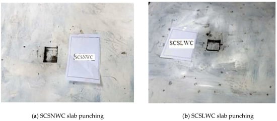 The specimens were square with 1200 mm side. Additionally, the thickness of the concrete core considered 78 mm. For SCS sandwich beam, it should be ensured that a 45° shear cracking of concrete can be resisted by at least one shear connector. For beams with shallow depth and lightweight concrete core, it is recommended that the spacing of the shear connectors should be at least equal to the core thickness to provide effective resistance against shear cracking of concrete core [21]. Therefore, the spacing of the connectors in both directions was assumed constant value of 100 mm for all slab specimens. Specimens conducted under concentrated patch load. The CSC connectors were used to make interlayer shear strength between concrete core and steel plates. The arrangement of holes for welding connectors on the bottom and top plates was different, as described in Table 7. Additionally, the holes in the plates were created by using CNC machines, as shown in Figure 7, and the CSC connectors welding arrangement were performed according to Figure 8a,b. After the welding operation, concreting was performed, and finally, after curing the concrete cores, the specimens were stained with white and prepared for testing, as shown in Figure 9.