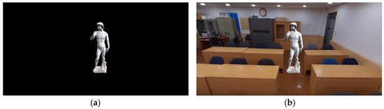 In general, 360° video is viewed by wearing a head-mounted display (HMD). Many people experience physical discomfort and symptoms such as headaches, disorientation, and nausea when they wear an HMD [1]. This is VR motion sickness. One of the reasons this occurs is due to the user receiving insufficient updates regarding sensory information from the vestibular system [2]. When 360° video content includes fast camera movement, visual information keeps changing but the user’s actual body position is fixed, which causes motion sickness. For this reason, most 360° video clips are taken from a fixed position. Synthesizing a virtual object into a fixed 360° video clip does not require a long processing time. The clip can be inserted at the desired position from the center of the camera. There have recently been various types of VR content used in film, education, and tourism which include stable movements filmed using special drones or cars. In the case of a 360° video clip including camera motion, a process of synchronizing the motion of the Red-Green-Blue (RGB) camera (actual camera) and a virtual camera is applied for the 3D composition. This process works by extracting internal (focal length) and external (position and rotation) parameters from the RGB camera used to capture a real scene [3,4]. From these parameters, we can retrieve the motion of the RGB camera, and this is called camera tracking [5]. The traditional 3D composition method estimates the trajectory of the camera by analyzing the feature points of each frame from the captured images. This method has a disadvantage in that the video resolution and camera-tracking processing times are proportional, and the composition results can only be confirmed after several processes (e.g., recording and camera tracking).