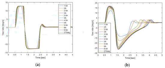 The yaw rate graphs of the vehicle model based on tire force observation when = 0.5. (a,b) are graphs of nominal yaw rate and actual yaw rate when the road adhesion coefficient is 0.5, using the vehicle model based on tire force observation.