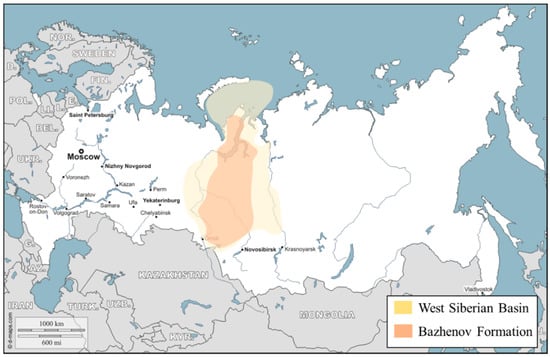 The Bazhenov Formation (BF) is located in the Russian Federation with an overall area >106 km2 []. Stratigraphically BF is Upper Jurassic–Lower Cretaceous rock represented by organic-rich mixed carbonate-clay-siliceous rocks. The BF is located over most of the West Siberian Petroleum Basin with a variable thickness of 15–80 m and with an average of 25–30 m (Figure 1) []. Bazhenov oil shales were deposited in the deep marine environment characterized by anoxia. According to the Lazar classification [], the Bazhenov rock samples are composed of different types of siliceous, argillaceous-siliceous and carbonate-argillaceous-siliceous rocks, which are enriched with OM. The organic matter (OM) contains the total organic carbon (TOC) in a range of 2 to 18 wt.% [,] and consists of kerogen, insoluble solid organic matter, and generating hydrocarbons, the quantity of which depends on the stage of maturity. The average mineral composition of the Bazhenov Formation is listed in Table 1.