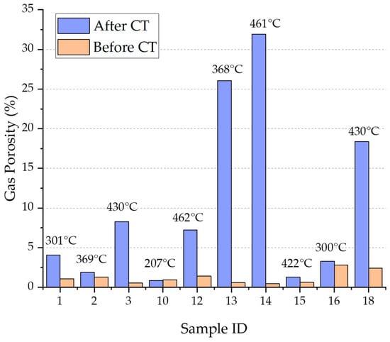 However, samples exposed to the same temperature demonstrate different behavior. This confirms the presence of multiple factors influencing the change in rock properties. Besides the CT section temperature, other important factors include the rock lithology, OM content, and maturity. Thus, the exposure temperature, location in the combustion tube (section), and initial properties of the rock might significantly affect the combustion results. In our case, we investigated samples from three oil fields with different rock lithology and OM maturation (Table 3). Oil fields 1 and 3 are of similar rock lithology—siliceous organic-rich shales. Oil field 2 is represented by mixed argillaceous-siliceous rocks. In turn, all oil fields have various OM maturity—oil fields 1 and 2 are at the beginning of the oil window but with higher generation potential for oil field 2. Rocks from Oil field 3 have OM at the peak of oil generation, and, therefore, they demonstrate distinct behavior (samples #16 and #18—Figure 14a,c,d). At the same time, samples #12 and #14 were exposed to the same temperature (463 °C and 461 °C, accordingly) and had a relatively same order of porosity and permeability before the experiment. However, their final values of porosity and permeability are drastically different (Table 4, Figure 14). Samples #13 and #14 from oil field 2 show very high gas porosity (26% and 32%) and permeability (5.7 mD and 4.2 mD). It can be explained by specifics of mineral composition (as for argillaceous-siliceous mudstone), higher OM maturity (than that for oil field 1), a higher amount of transformed kerogen (proved by S2 values), or other technical reasons such as the occurrence of large fractures and voids. In other words, it is crucial to account for the rock heterogeneity in original reservoir properties and technical specifics of the experiment when modeling the HPAI for target oil fields.