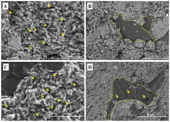 SEM images of the samples before the experiment: (A) voids in the sample #12, (B) organic matter in sample #12; (C) voids in the sample #16/18, (D) porous organic matter in the sample #16/18.