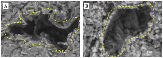 Voids initially filled with OM. SEM images of the samples after the experiment (A) sample 12, (B) sample #16.