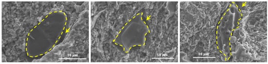 Shrinkage of OM, arrows indicate vacated space around an inclusion. SEM images of the sample #16 after the experiment.