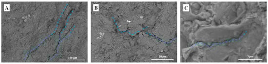 After the combustion experiment, both samples showed new voids appearing in the porous volume, initially filled by organic matter (Figure 5). Some OM inclusions looked to be shrunk after the heating and did not occupy all available space around them; this effect was observed mainly for sample #16 (Figure 6). The most common and evident change is new fractures, which formed along with the lamination in µm–nm scales (Figure 7). Some fractures intersected each other and formed a connected channel (Figure 7a). The fractures at a smaller scale (50 µm and less) were mainly closed and very thin (up to 1–2 μm); thus, they did not contribute to the increase of porosity and permeability after the combustion. Finally, we observed a noticeable increase in pore size and homogeneity of its distribution in sample #16 (Figure 8).