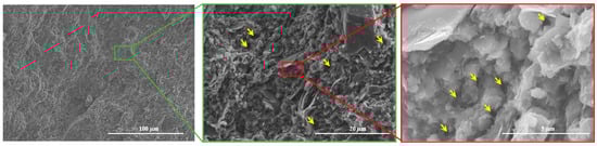 SEM was used for high-resolution 2D imaging and rock structure characterization. By means of the Thermo Fisher Scientific Quattro S electron microscope, we analyzed small rock probes (3–5 mm in size) split from main samples. The microscope allowed us to work with an electron beam current range from 1 pA to 200 nA with accelerating voltage 200 V to 30 kV. The highest spatial resolution was 5 nm (30 kV). Scanning included using secondary electrons (SE) and backscattered electrons (BSE), magnification range ×500–35,000 k, acceleration voltage 10–15 kV, working distance 9–11 mm with approximately 5–6 nm maximum pixel size []. The dimensions of the resulting images are 1536 × 1094 px.