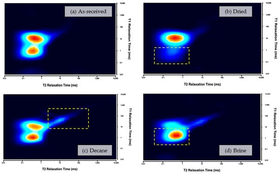 T1–T2 maps of BF sample—Sample n5—in (a) as-received state; (b) dried state; (c) decane-saturated state; (d) brine-resaturated state.
