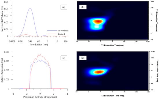 NMR analysis of sample #16: (a) T2 relaxation before (blue) and after CT (red); (b) T1–T2 map for as-received sample; (c) saturation profiles before (blue) and after CT (red); (d) T1–T2 map for the burnt sample.