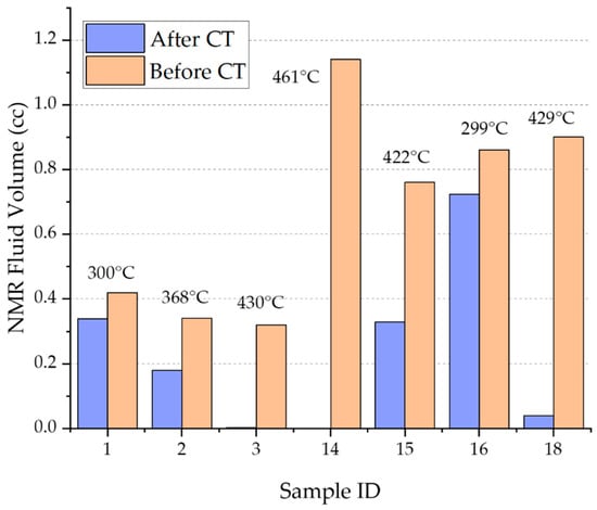 After the combustion, there was a near-zero volume of fluids left in the samples (Figure 11). At first approximation, the residual fluid saturation for target rocks depends on their initial saturation, the temperature of the zone, and the combustion tube section. We clearly observed an apparent decrease in total fluid volume for samples that were exposed to 300–369 °C, whereas in sections with higher temperatures, the fluid was almost completely removed. Exceptions can be explained by the example of sample #15, where a certain amount of fluid remained after exposure to 422 °C. This sample was located in CT section, which is near the end of the propagation front. We explain remaining fluid by the generated oil. Thus, the results of measurement mainly indicate the displacement and burning of hydrocarbons from cylindrical samples along the combustion front, but this difference is controlled by several factors. These factors primarily include the petrophysical background of the rock samples (rock lithology, OM properties) and experiment conditions (temperature in the CT zone, location in CT, and duration of exposure).