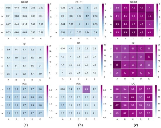 To better understand the effect of the combustion front on a larger scale (than that used for sand or core pack), we decided to perform 2D pyrolysis on three samples after the CT experiment. The core plugs were selected from different sections of the tube: #12 (Figure 12b) and #15 (Figure 12c) from the highest temperature zone 4, #10 (Figure 12a)—from the lowest temperature zone 6. Heat maps, showing distributions of free hydrocarbons, as the sum of peaks S0 and S1 in classic pyrolysis, kerogen (S2 in classic pyrolysis), and TOC values for three samples are shown in Figure 12, correspondingly.