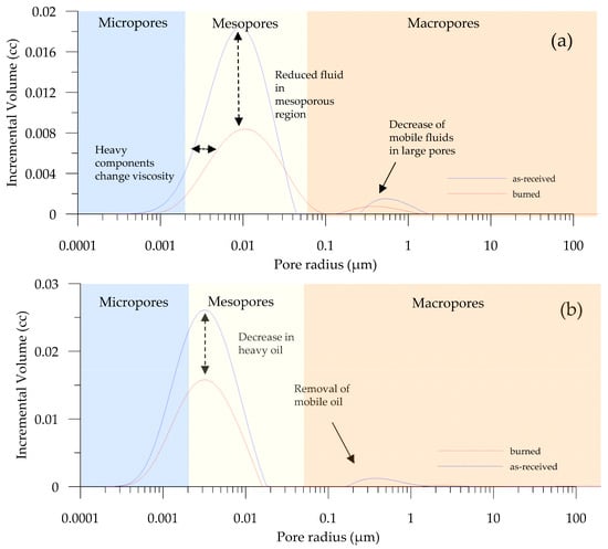 NMR measured the change in total fluid volume of the sample and the spatial saturation using 1D NMR profiling. We used T2 relaxation curves for illustrating the distribution of fluid-occupied pores inside the rock (Figure 13a,b). Images illustrate how the liquid phase was redistributed in the samples exposed at different temperatures. Sample #2 (located in Section 2.2) shows a decrease in the number of pores filled with the heavy components, and residual fluid relocation to larger pores, after the combustion. In the case of sample #12 (CT section—where the temperature reaches the maximum value), we observe the entire removal of mobile fluids and a small number of heavy components in the microporous region.