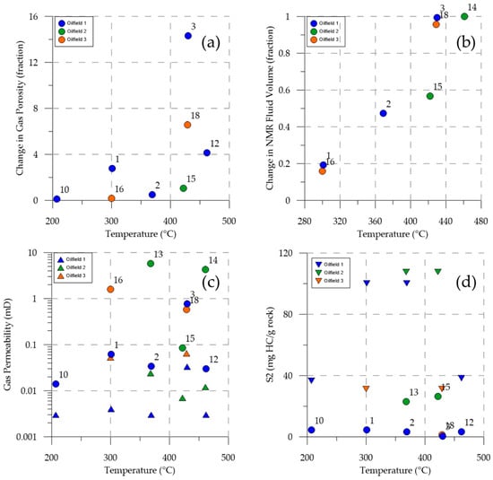 Cross plot of (a) porosity by gas; (b) permeability; (c) residual saturation by NMR; (d) residual TOC vs. temperature. Change of porosity and NMR fluid volume is calculated as follows: Change (fraction) = (parameter before CT − parameter after CT/parameter before CT). Triangle-shaped symbols indicate the measured parameter before CT. Samples #13 and #14 are not demonstrated at (a) due to high values of gas porosity (see Table 4).