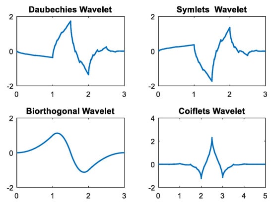 The mother wavelets used in the DWT are db, sym, coif, and bior []. Each mother wavelet provides a differential coefficient because of its differential characteristic signal, as shown in Figure 1.