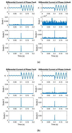 The example of differential current obtained from the transformer (relay 1) in case of internal fault and the coefficient after using different mother wavelets is shown in Figure 4. From the figure, it can be seen that the DWT signals at scale 1 generate much noise compared with those at scales 2–3. The coefficients at scales 2–3 are notable when faults occur, and at scale 3, a lower frequency can be detected compared to that at scale 2. Thus, this research chose the coefficients at scale 2 for analysis of the fault types.