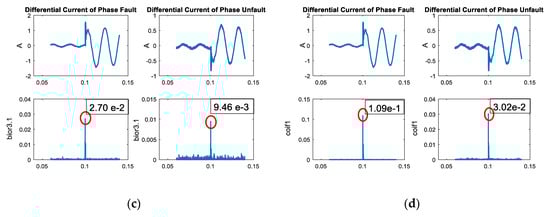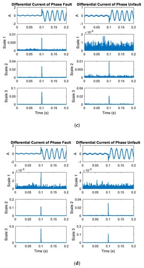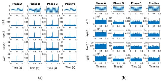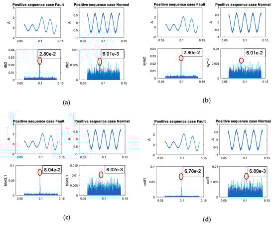 Differential current signals from the wavelet transform in the case of internal faults at phases in each mother wavelet: (a) Daubechies (db2); (b) symlets (sym2); (c) biorthogonal (bior3.1); (d) Coiflets (coif1).