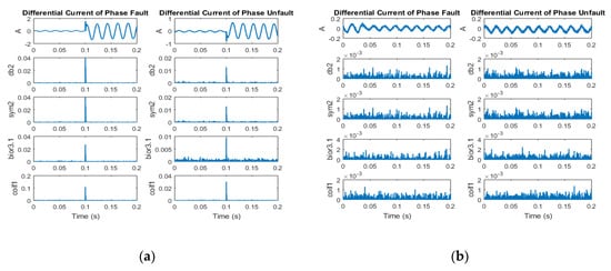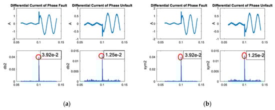 After recording the differential current from the transformer, the differential current is obtained through the wavelet transform method. The current signal is transformed using the DWT to extract high-frequency components at scales 1–3 with different mother wavelets, such as the Daubechies (db), symlets (sym), biorthogonal (bior), and Coiflets (coif) wavelets. The coefficient from the DWT is varied depending on various factors, and this coefficient is squared to emphasize the change in coefficient. The four mother wavelets are utilized to decompose the differential current signals. The DWT coefficients of the phase faults are larger than those of the phase unfaults.
