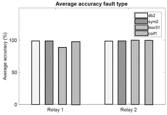 For the case study of the different mother wavelets, the accuracy of the results is summarized in Table 3. The faults in the case study are discriminated by using the proposed algorithm. It is found that there is an average accuracy of internal fault detection (relay 1) of 96.12% and of external fault detection (relay 2) of 99.07%. The mother wavelet types of Daubechies (db2) and symlets (sym2) provide the highest accuracy under condition 1, while the mother wavelet type of biorthogonal (bior3.1) provides the highest accuracy under condition 2, as shown in Figure 10.