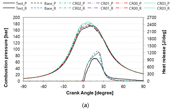 Figure 7 shows the results of the location of the maximum pressure of combustion, versus the turbocharger compression ratio and the water content of the emulsion fuel. The experimental results and numerical results show that the location of the maximum pressure of combustion tends to be very consistent. Figure 7 shows that the location of the maximum pressure of combustion is retarded in the lower region of the model of the basic engine, but the position of the maximum pressure of combustion is significantly advanced in the region of more than 50% of load. This shows that the duration of post-combustion can be shortened, which is expected to reduce black carbon in the exhaust emissions. Figure 8 shows that the turbocharger compression ratio is CR03 and the moisture content is 16%, depending on the water content of the emulsion fuel. Due to this phenomenon, fuel atomization was accelerated due to micro-explosion of water, and combustion time was shortened due to sufficient air, in turn due to the increased compression ratio of the turbocharger.