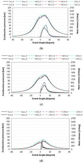 Figure 4 shows the combustion pressure and heat generation rate versus the change in the turbocharger nozzle ring, using emulsified MDO containing 10% moisture. Here, Test_P is the combustion chamber pressure diagram obtained through the experiment. Base_P is the numerical result obtained by comparing with experimental results. CR00_P, CR01_P, CR02_P and CR03_P are combustion chamber pressure diagrams obtained through numerical analysis according to the compression ratio of the turbocharger. R in Test_R means Rate of heat release. From Figure 4 it is seen that the combustion pressure increased with increasing pressure ratios of the nozzle ring of the turbocharger. It is seen that combustion is activated due to an increase in the amount of air introduced, in turn due to an increase in the pressure ratio. In addition, when the experimental results were compared with the numerical results, the combustion pressure was seen to increase as the pressure ratio of the turbocharger increased, and the overall combustion pressure increased due to the effects of the pressure ratio of the turbocharger and the use 10% emulsified fuel. In addition, from the results in all load ranges of Figure 4a–e, comparing the characteristics of heat generation rate with the experimental results shows that post combustion is shortened, due to the pressure ratio of the turbocharger and the use of emulsion fuel. This is expected to affect the reduction of nitrogen oxides and black carbon.