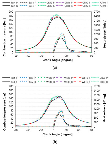 Figure 5 and Figure 6 show the combustion pressure and heat generation rate, versus the compression ratio of the turbocharger, when the water content of the emulsion fuel is 13% and 16%, respectively. As shown in Figure 5 and Figure 6, combustion pressure increases and post-combustion is shortened by the effect of water on the emulsion fuel.