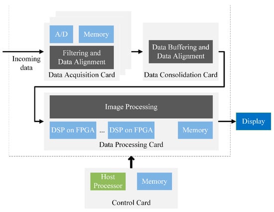 Medical imaging uses many different methods such as magnetic resonance (MR) imaging [,,,,,,,], radiography [,,,], radionuclide [,], optical [,,], ultrasound [,] and medical robotics [,]. The typical medical imaging system consists of three components (Figure 1): data acquisition, data consolidation and data processing. The data acquisition card, which filters incoming data, is the most cost-sensitive system card. Usually, a diagnostic imaging system will consist of multiple data acquisition cards. Once the data is compensated and filtered in scanners, it is sent to the data consolidation card for buffering and data alignment. Once the data has been collected, it is sent to the image processing cards []. These cards perform heavy-duty filtering and the most algorithm-intensive image reconstruction. Modern field-programmable gate array (FPGA) devices are widely used in data consolidation, and image processing for sophisticated application algorithms implementation including pattern recognition, image enhancement and data compression [,].