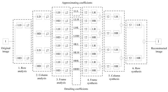 We get the reconstructed image as a result of image decomposition coefficients synthesis. Theoretically, the original image should be fully reconstructed since the scheme in Figure 2 has the perfect reconstruction property []. However, quantization noise occurs due to the digital format of wavelet filters coefficients representation in practice. Quantization noise distorts all image decomposition coefficients and as well as reconstructed image . The images DWT result may have a quality unacceptable for the task depending on the magnitude of quantization noise.
