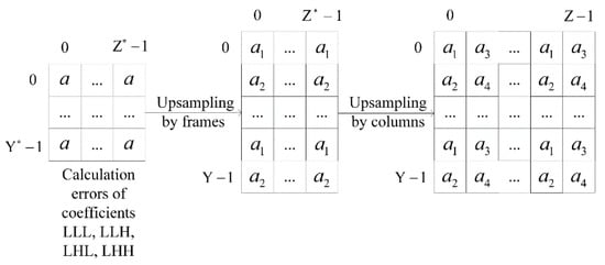 The errors of all image decomposition coefficients and are separated into two groups as a result of upsampling . Figure 3 shows an example of the errors separation at the upsampling by frames and columns, where and . This situation is similar for upsampling by strings. Upsampling is applied three times during image restoration. We got eight groups of errors as a result. Thus, we would add an additional index to the introduced notations, which denotes calculations by the spatial characteristics of wavelet filters coefficients.