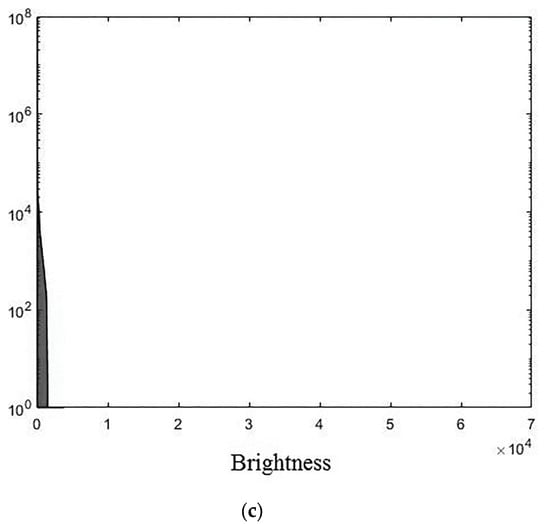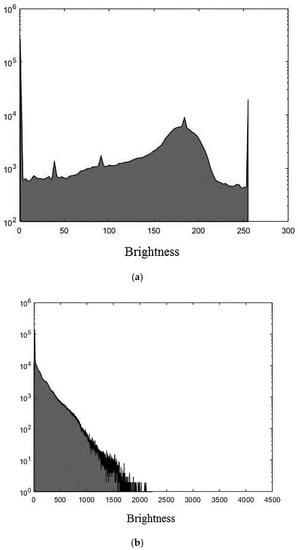 The experiments were conducted using MatLab software version R2018b for the three 3D medical tomographic grayscale images: “wmri” is the 8-bit image of size ; “Trufi_COR” is the 12-bit image of size and “Body_1.0” is the 16-bit image of size . These images have the following histograms (Figure 4). The larger the image bitness, the lower its ratio of the average voxel brightness to the maximum allowed. We show the influence of this factor on the image processing quality further.
