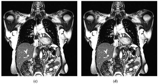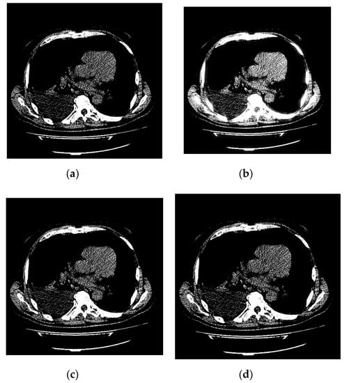 The darkening and lighting in Figure 5, Figure 6 and Figure 7 were due to the low accuracy of wavelet filters coefficients quantization used for image processing. The excessive character of quantization error led to an increase in the voxels brightness values of the processed images. Figure 6b and Figure 7b turned out to be lighted since 12- and 16-bit images had a brightness margin, which is shown by the histograms in Figure 4b,c. However, the range of brightness values of the 8-bit image was fully utilized (Figure 4a) and the quantization error led to the computational range overflow. The voxels brightness values that exceeded the range went to zero as a result of this.