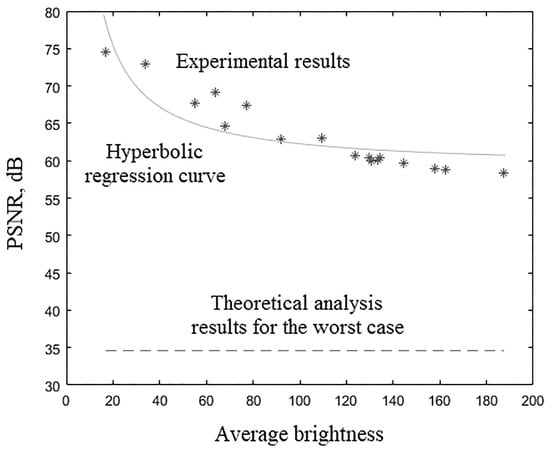 The nonlinear hyperbolic regression [] curve for the data from Table 34 was plotted in Figure 8 and has the equation , where is the average brightness of the image voxels. The -test value [] for constructed nonlinear hyperbolic regression curve is actually observed. The -test critical value [] for false-rejection probability with degrees of freedom and is , where is the regression equation estimated parameters number and is the images number from Table 34. Since resulting regression equation is significant at false-rejection probability . Equation asymptote exceeds the corresponding theoretical calculations values.