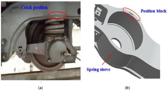 A crack was found at the spring sleeve of one metro bogie frame (as shown in Figure 1a) and the service life is less than 200,000 km. The spring sleeve of the frame side beam is welded by upper cover, lower cover and circular plate. The positioning block is welded to the spring sleeve lower cover by four welds, as seen in Figure 1b. The crack initiated from the weld toe of the positioning block and then propagated to the spring sleeve circular plate with maximum 110 mm in length, as shown in Figure 1c,d.