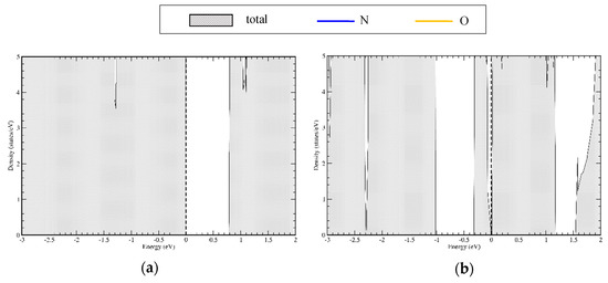 When NO2 is adsorbed on the pristine SnSe2, the total DOS presents a trap state across EF in the energy range about −0.04 eV to –0.02 eV, as shown in Figure 4a. A large amount of PDOS induced by N and O atoms of gas molecule is located in the aforementioned trap state, which induces the flat band and trap electron on it as mentioned in previous work [8]. The pattern of DOS in Figure 4a is different from DOS of the pristine SnSe2 monolayer without adsorption as shown in Figure 2a.