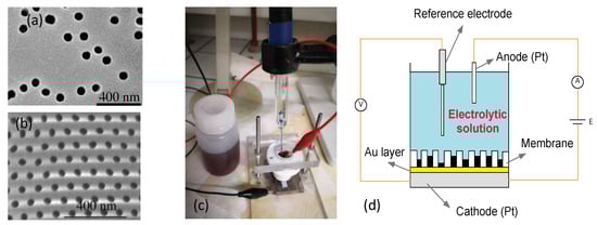 - Masuda, H.; Fukuda, K. Ordered Metal Nanohole Arrays Made by a Two-Step Replication of Honeycomb Structures of Anodic Alumina. Science 1995, 268, 1466. [Google Scholar] [CrossRef]