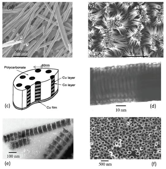 - Doudin, B.; Blondel, A.; Ansermet, J.P. Arrays of multilayered nanowires (invited). J. Appl. Phys. 1996, 79, 6090–6094. [Google Scholar] [CrossRef]