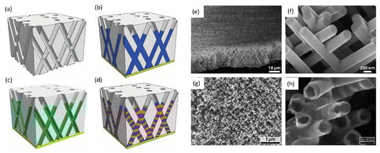 Recently, 3D nanoporous templates were obtained by performing a sequential multi-step exposure of energetic heavy ions, at various angles with respect to the normal of polycarbonate film surface [,]. Then, the latent tracks within the polymer film were chemically etched following the previously reported protocol to obtain membranes with distinct porosities and pores sizes []. Hereafter, the as-prepared polymer membranes containing networks of interconnected cylindrical nanopores were designed with pores of well-defined diameters between 40 and 230 nm and with different porosity characteristics ( 3% and 20%, with P the void volume fraction of the membrane). Next, the template-assisted electrodeposition method was used for the synthesis of well-defined 3D architecture consisting of crossed nanowire (CNW) and nanotube (CNT) networks [,,,,]. In addition, magnetic and non-magnetic layers were electrochemically stacked to make interconnected multilayered nanowires [,,]. Figure 4 illustrates the various 3D nanofiber architectures which have so far been investigated. After electrodeposition, the complete dissolution of the PC template leads to an interconnected metallic self-standing structure, as the one observed for the 40 nm and 230 nm diameter Ni CNW network shown in Figure 4e–g. The CNW network exhibits the replicated complex nanowires branching morphology of the porous template.
